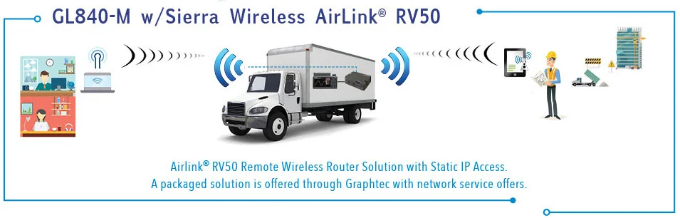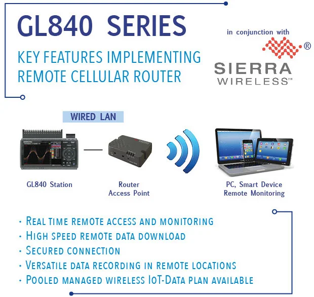 Graphtec offers a solution for remote monitoring, recording and downloading of data by utilizing a cellular gateway with secure internet connection. Combining the power of Graphtec portable data logging solutions with the Sierra Wireless Airlink® RV50 cellular router provides a 4G/LTE connection for cellular remote access to the GL840. Remote units can be powered from an 8.5 to 24VDC source or using a AC/DC power supply.