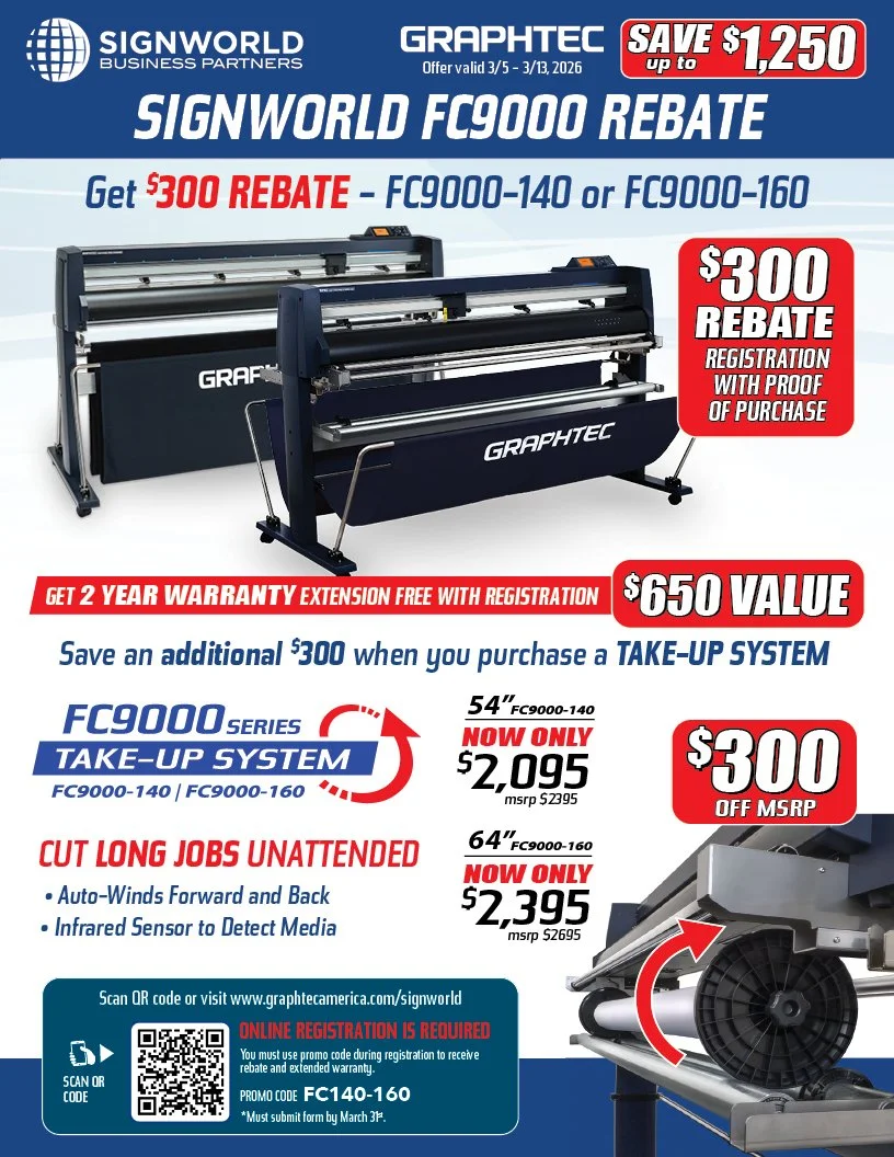 For SIGNWORLD FC9000 REBATE rebate is valid from 03/5/26 to 03/13/26. You have until 3/31/26 to submit the form. Please allow 4 to 6 weeks for processing.